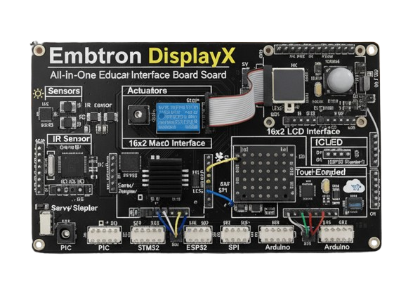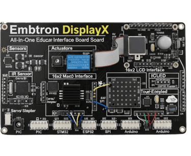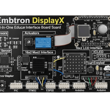Embtron DisplayX is a dedicated display and user-interface learning board. It helps learners work with LCDs, OLEDs, touchscreens, keypads, and encoders to build interactive human–machine interfaces. Ideal for academic labs and embedded UI development.