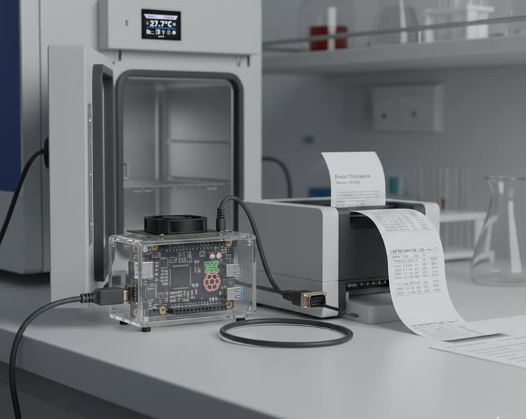 This project enables seamless communication between a laboratory incubator and a thermal printer for instant printing of logs, reports, or alerts. The system collects data stored in csv or plkx format from the incubator’s USB/serial interface, processes it automatically, and prints it immediately without manual intervention. It ensures smooth data transfer, fast printing, and reliable operation in laboratory environments.